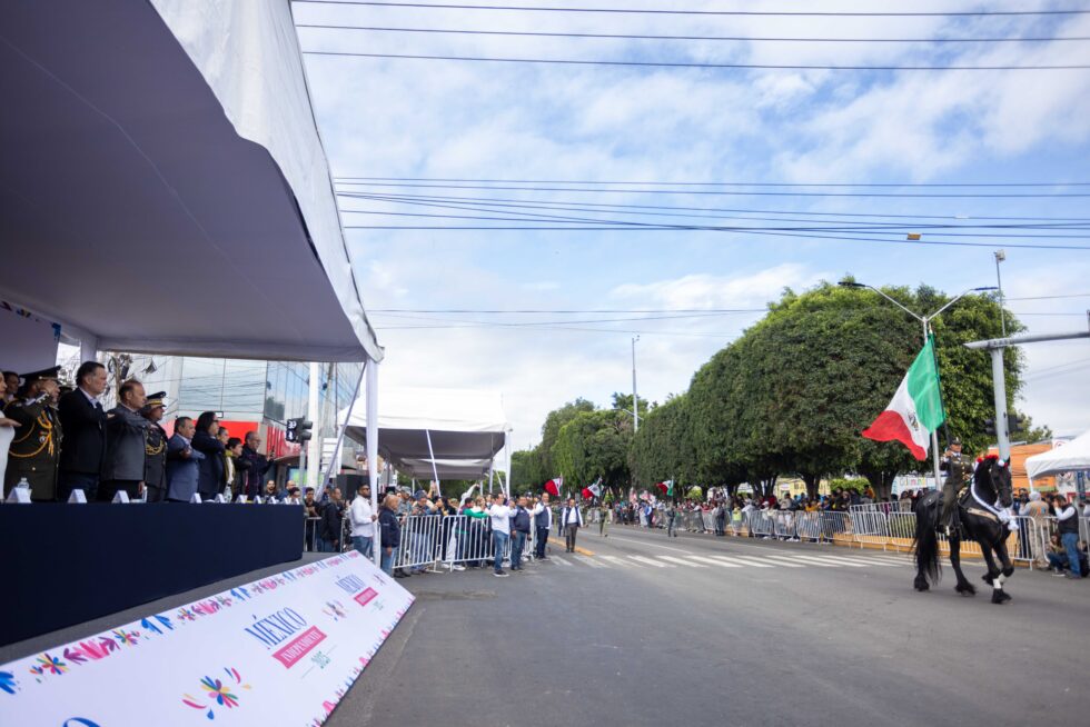 Acompañado por los titulares de los poderes Legislativo y Judicial, Gerardo Ángeles y Braulio Guerra Urbiola, el comandante de la XVII Zona Militar, Guillermo Lira Hernández, y el presidente municipal, Felifer Macías, el titular del Poder Ejecutivo atestiguó el paso de un grupo de motociclistas de la Policía Estatal (PoEs), una bandera monumental, así como escoltas que encabezaron la columna de contingentes.