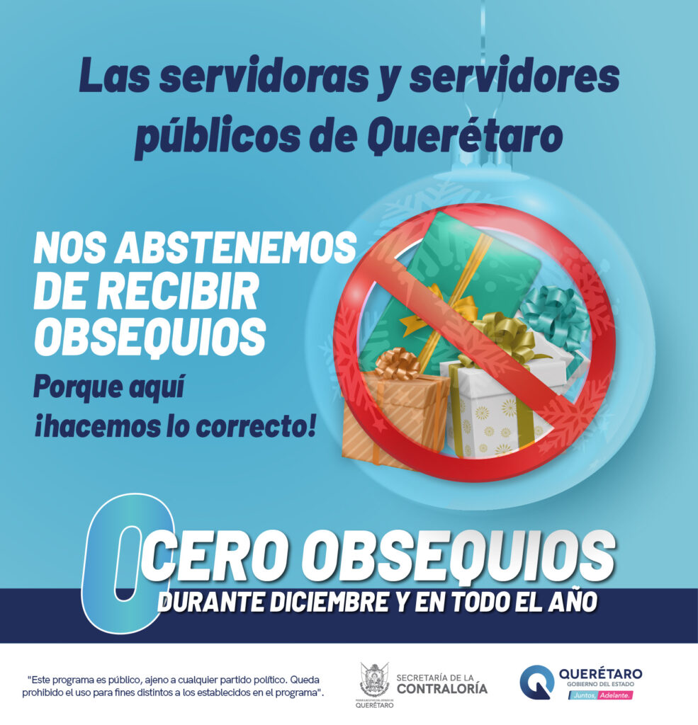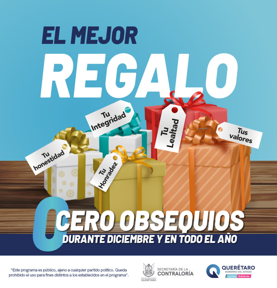Las líneas para denunciar a quienes reciban obsequios son: 442 235 3482 ext. 2000; la página web http://www2.queretaro.gob.mx/contraloria/denuncias.php; buzón electrónico quejasydenunciasqueretaro.gob.mx, la App Qro; o de manera presencial en Av. Corregidora Sur 16 Col Cimatario.