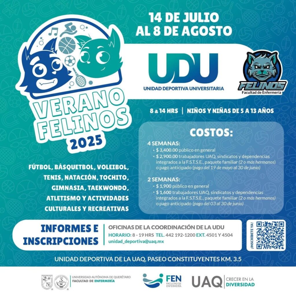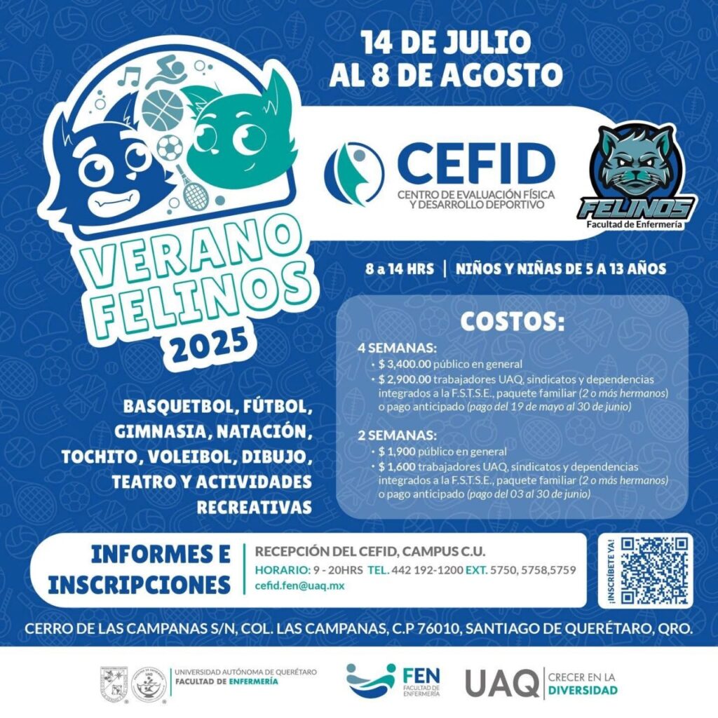 La Universidad Autónoma de Querétaro (UAQ) a través de la Facultad de Enfermería (FEn), llevará a cabo el curso “Verano Felinos”, dirigido a niñas y niños de 5 a 13 años, en dos sedes de la Máxima Casa de Estudios queretana: la Unidad Deportiva Universitaria (UDU), ubicada en el municipio de Corregidora; así como el Centro de Evaluación Física y Desarrollo Deportivo (CEFID), con sede en Centro Universitario.
