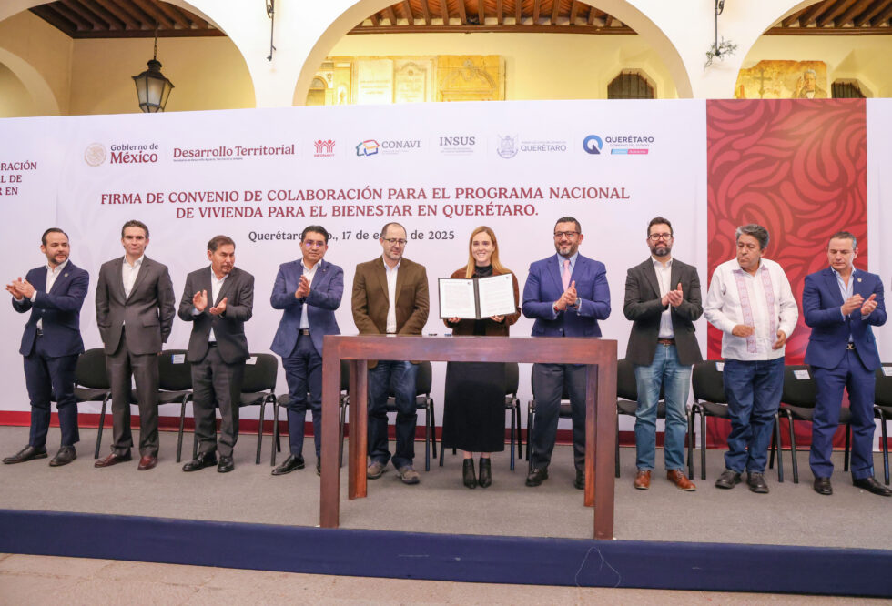 El funcionario estatal encabezó, junto a la secretaria de la Juventud, Virginia Hernández Vázquez, la firma del Convenio de Colaboración para la implementación del Programa Nacional de Vivienda para el Bienestar en Querétaro que impulsa el Gobierno Federal y con el que se prevé construir 16 mil viviendas en la entidad.