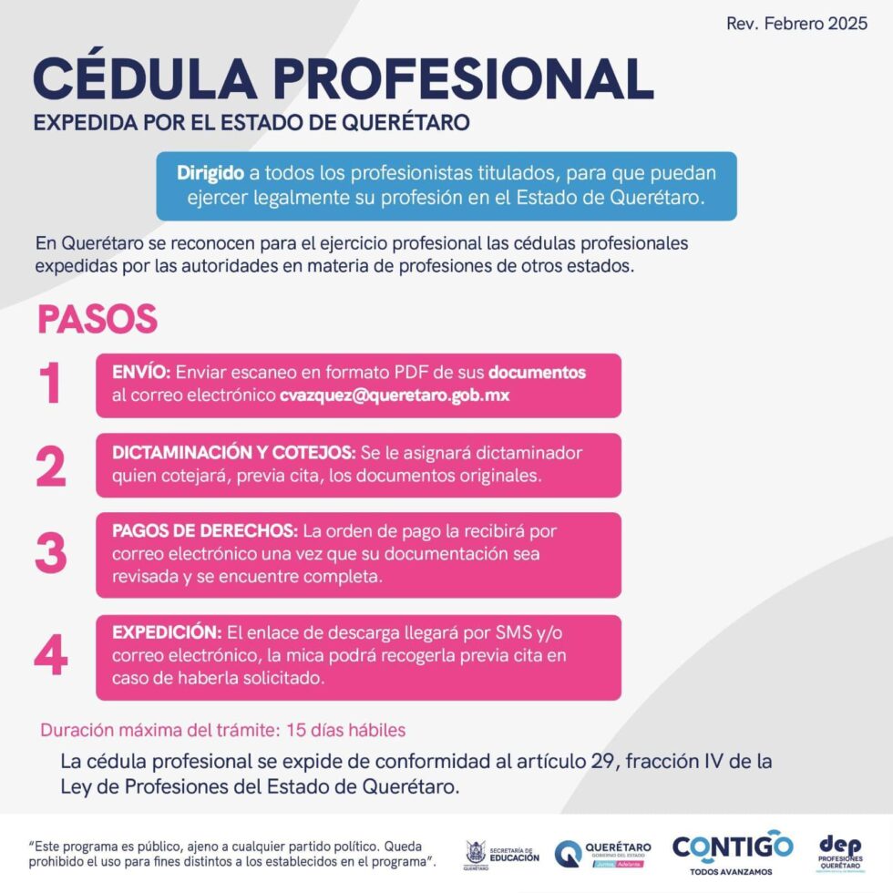 - La Secretaría de Educación del Estado de Querétaro (SEDEQ) invita a las y los egresados a tramitar su Autorización Provisional para Ejercer y su Cédula Profesional expedida por la Dirección Estatal de Profesiones, la cual tiene como finalidad brindar certeza del ejercicio legal de su profesión ante cualquier persona, empresa o dependencia gubernamental. Puede tramitarse para los niveles educativos de Técnico Superior Universitario, Licenciatura, Maestría, Doctorado o Especialidad