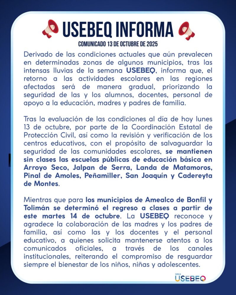 Mientras que para los municipios de Amealco de Bonfil y Tolimán se determinó el regreso a clases a partir de este martes 14 de octubre. La USEBEQ reconoce y agradece la colaboración de las madres y los padres de familia, así como las y los docentes y el personal educativo, a quienes solicita mantenerse atentos a los comunicados oficiales, a través de los canales institucionales, reiterando el compromiso de resguardar siempre el bienestar de los niños, niñas y adolescentes.