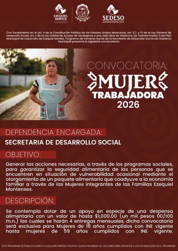Por segundo año consecutivo, el Gobierno Municipal de Ezequiel Montes, encabezado por el presidente municipal Ing. Iván Reséndiz Ramírez, pone en marcha el programa Mujer Trabajadora, una iniciativa que reafirma nuestro compromiso con quienes más lo necesitan.