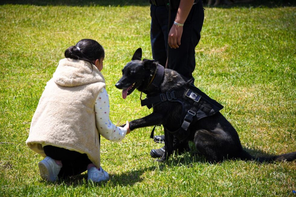 En las instalaciones del Grupo Canino K9, los visitantes tuvieron la oportunidad de interactuar con el personal operativo de la institución, donde participaron en una demostración a cargo de oficiales policiales en conjunto con los ejemplares caninos que integran este grupo.