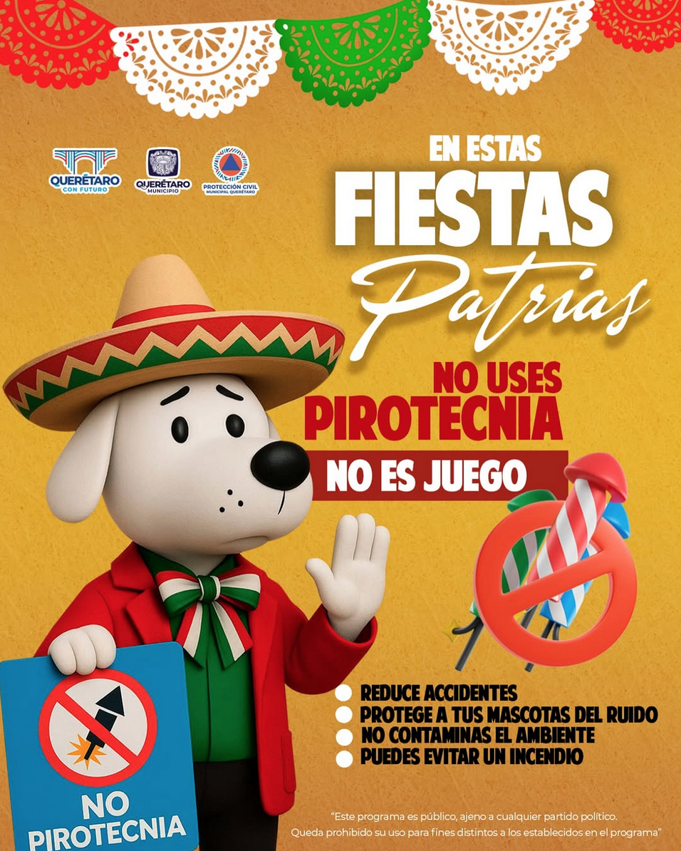 - La Secretaría de Bienestar Animal del Municipio de Querétaro hace un llamado a la ciudadanía para celebrar las fiestas patrias sin pirotecnia, pues el estruendo de los fuegos artificiales provoca miedo y ansiedad en los animales y puede desencadenar crisis que pongan en riesgo su salud y su seguridad.